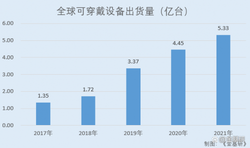 可穿戴設(shè)備市場方面,伴隨智能可穿戴設(shè)備行業(yè)在各垂直領(lǐng)域應(yīng)用程度的加深,智能可穿戴設(shè)備行業(yè)持續(xù)擴(kuò)容。據(jù)IDC數(shù)據(jù),2017-2021年,全球可穿戴設(shè)備出貨量分別為1.35億臺(tái)、1.72億臺(tái)、3.37億臺(tái)、4.45億臺(tái)、5.33億臺(tái)。