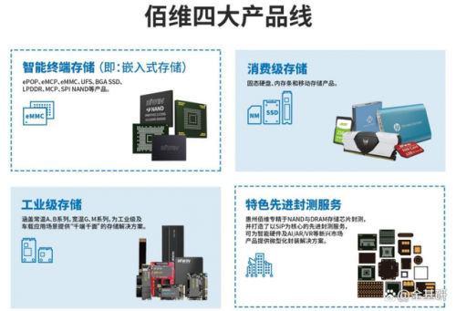 具體來看,佰維存儲(chǔ)專精于半導(dǎo)體存儲(chǔ)器領(lǐng)域,布局了嵌入式存儲(chǔ)(UFS、eMMC、LPDDR、eMCP、MCP、SPI NAND、BGA SSD等)、固態(tài)硬盤(SATA/PCIe)、內(nèi)存模組(SO-DIMM/U-DIMM)、存儲(chǔ)卡(SD卡、CF卡、CFast卡、CFexpress卡、NM卡)等完整的產(chǎn)品線矩陣,涵蓋NAND Flash和DRAM存儲(chǔ)器的各個(gè)主要類別。
