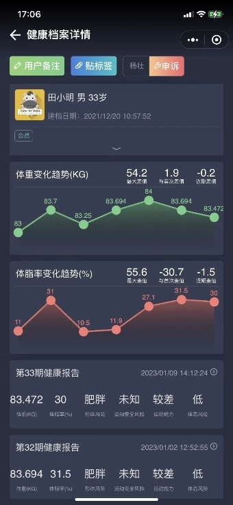 宅客科技首創(chuàng)健康檔案對比分析功能,完整記錄了會員的各項身體參數(shù)的變化趨勢,便于教練更好對比訓(xùn)練服務(wù)成果。每一次的測量記錄清晰可見,對于學(xué)員來說,可以直接看到自己通過訓(xùn)練后,身體是否有變化,很直觀的感受自己的投入值不值;對于場館而言,可根據(jù)歷史大數(shù)據(jù)開發(fā)更有針對性的訓(xùn)練課程以及提供更好的運營思路。