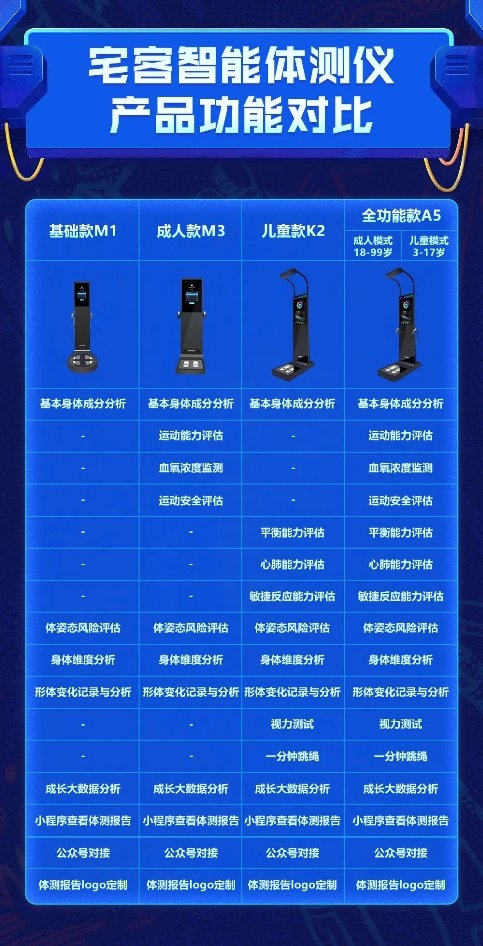 隨著社會經(jīng)濟(jì)的發(fā)展,傳統(tǒng)體測設(shè)備已經(jīng)不能滿足場館的經(jīng)營需求。越來越多的運動機(jī)構(gòu)開始追求現(xiàn)代化智能化。普通體測儀只能測量體重體脂等簡單幾個指標(biāo),不能很好契合運動場館對人體運動能力多個維度的數(shù)據(jù)訴求,宅客智能體測儀除了可以測量成人的體成分、血壓心率、血氧濃度等功能以外,還專門針對青少年兒童群體獨家研創(chuàng)了平衡能力、敏捷反應(yīng)、裸眼視力、肺活量、一分鐘跳繩測試功能,另外還涵蓋10個維度40多項健康數(shù)據(jù),包括蛋白質(zhì)、水分、無機(jī)鹽、新陳代謝、骨量、肌肉率等,確保能完整覆蓋運動場館業(yè)務(wù)場景需求。