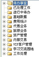 該平臺包括:(待辦事宜、已處理工作、進(jìn)行中待辦)、基礎(chǔ)數(shù)據(jù)、費(fèi)用統(tǒng)計、代售業(yè)務(wù)、旅游業(yè)務(wù)、資產(chǎn)管理、內(nèi)部交易、VIP客戶管理、學(xué)習(xí)交流園地和工作處理十大模塊。