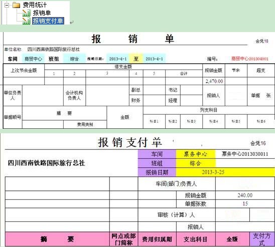 四川西南鐵路國際旅行總社旅游業(yè)務(wù)分別按旅游團(tuán)隊收支計劃單、旅游團(tuán)隊成本報銷單、團(tuán)隊票申報兌現(xiàn)情況登記單、專列申報兌現(xiàn)情況登記表幾個子目錄分別錄入。