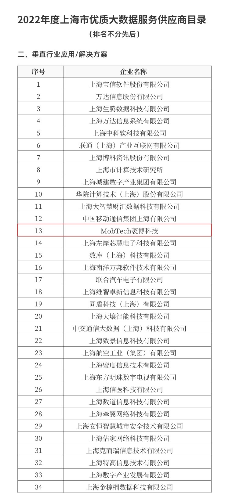近日,上海市經(jīng)濟和信息化委員會發(fā)布了“2022年度上海市優(yōu)質(zhì)大數(shù)據(jù)服務(wù)供應(yīng)商目錄”,MobTech袤博科技與移動、聯(lián)通、萬達信息、第 一財經(jīng)等知名企業(yè)共同入選。這也是繼2020年入選后,企業(yè)再度入圍該目錄。