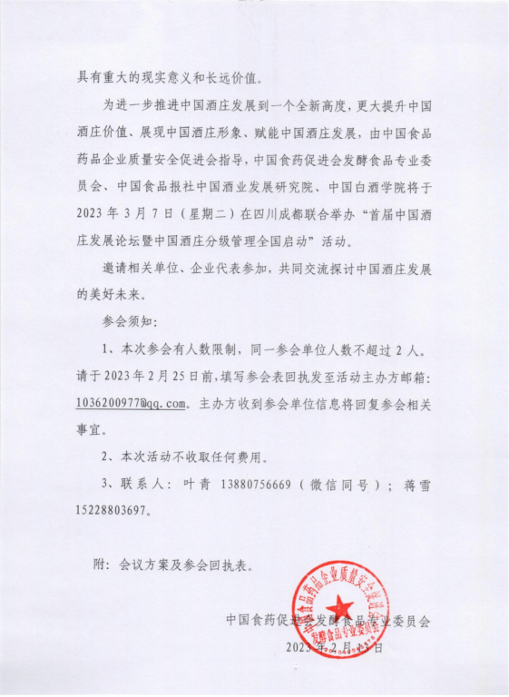 為進一步推進中國酒莊發(fā)展到一個全新高度,更大提升中國酒莊價值、展現(xiàn)中國酒莊形象、賦能中國酒莊發(fā)展,由中國食品藥品企業(yè)質(zhì)量安全促進會指導(dǎo),中國食藥促進會發(fā)酵食品專業(yè)委員會、中國食品報社中國酒業(yè)發(fā)展研究院、中國白酒學(xué)院將于2023年3月7日(星期二)在四川成都聯(lián)合舉辦“首屆中國酒莊發(fā)展論壇暨中國酒莊分級管理全國啟動”活動。