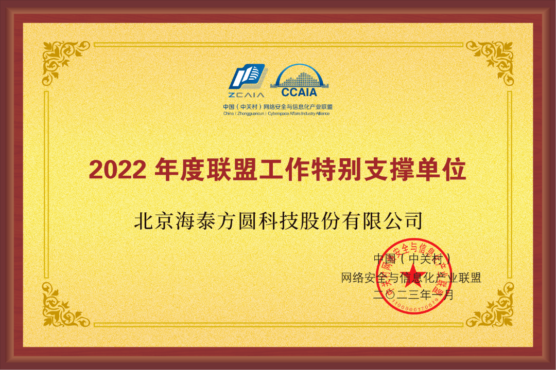 2023年2月11日下午,中關(guān)村網(wǎng)絡(luò)安全與信息化產(chǎn)業(yè)聯(lián)盟(以下簡(jiǎn)稱“聯(lián)盟”)線上召開聯(lián)盟第二屆第五次會(huì)員大會(huì)。會(huì)上,聯(lián)盟為特別突出貢獻(xiàn)的會(huì)員企業(yè)給予了獎(jiǎng)勵(lì)和肯定。海泰方圓斬獲“《中國網(wǎng)信產(chǎn)業(yè)橘皮書—數(shù)據(jù)安全》突出貢獻(xiàn)單位”“2022年度網(wǎng)信市場(chǎng)潛力單位創(chuàng)新活力獎(jiǎng)”“2022年度聯(lián)盟工作特別支撐單位”三項(xiàng)榮耀,榮譽(yù)的獲得將激勵(lì)海泰方圓在2023年輸出更出色的工作成果,為聯(lián)盟的高質(zhì)量發(fā)展貢獻(xiàn)力量。