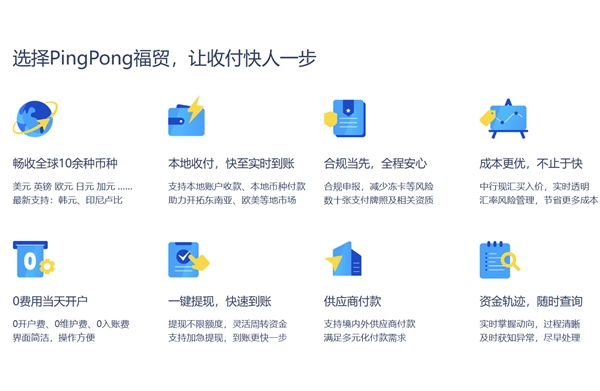 同時,為了避免因匯率波動帶來的糾紛,PingPong福貿(mào)卓越的時效性,貨 款最 快可當(dāng)日達(dá),在爭分奪秒創(chuàng)造財富的關(guān)鍵期,守護(hù)好你的每一分利益。