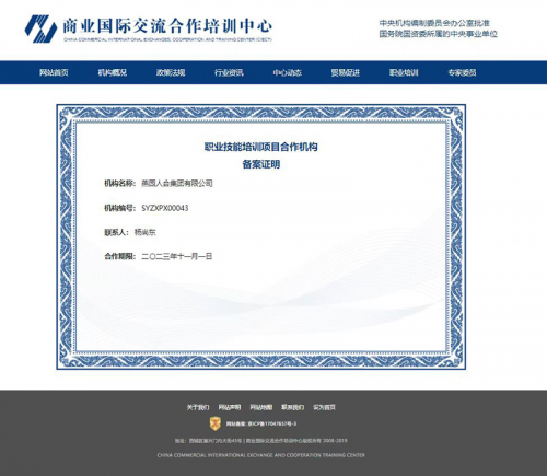 燕園人合集團(tuán)有限公司成為商業(yè)國(guó)際交流合作培訓(xùn)中心備案職業(yè)技能培訓(xùn)項(xiàng)目合作機(jī)構(gòu),主要負(fù)責(zé)面向全國(guó)各城鄉(xiāng)運(yùn)營(yíng)與推廣:互聯(lián)網(wǎng)營(yíng)銷(xiāo)師、企業(yè)培訓(xùn)師、心理咨詢師及全媒體運(yùn)營(yíng)師等熱門(mén)職業(yè)技能培訓(xùn)項(xiàng)目。
