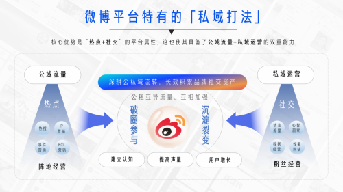 微博作為領(lǐng) 先的開放式社交媒體平臺,海量公域流量與用戶關(guān)系交織融合,私域和公域緊密相連,這一優(yōu)勢決定了微博特有的“私域打法”。公私域聯(lián)動能夠幫助品牌利用公域流量場快速提高聲量,沉淀私域社交資產(chǎn),從而影響用戶心智,實現(xiàn)更持續(xù)的價值釋放。