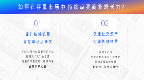 簡言之,由公私域引流所積累的社交資產(chǎn)就是品牌營銷的核心競爭力。那么如何在存量市場中高效沉淀社交資產(chǎn),持續(xù)點亮商業(yè)增長力?有兩個問題亟需解決:一是提升私域流量留存率與活躍度,不斷為用戶創(chuàng)造更好的體驗,從而占領(lǐng)用戶心智;二是要完成社交資產(chǎn)的反復(fù)利用開發(fā)與不斷優(yōu)化,以此激發(fā)品牌私域經(jīng)營能力,實現(xiàn)長效經(jīng)營。
