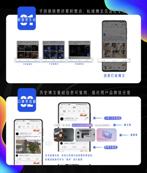 “可累積”是指在一個創(chuàng)意下,不同子創(chuàng)意產(chǎn)生的所有“轉(zhuǎn)贊評”會累積在創(chuàng)意打底博文?!翱蓮?fù)用”是指新建創(chuàng)意時,可直接將歷史已有博文的“轉(zhuǎn)贊評”等信息作為“組件”進(jìn)行復(fù)用,從而避免廣告博文所展現(xiàn)的互動數(shù)據(jù)差的情況,增加用戶的品牌信任度。