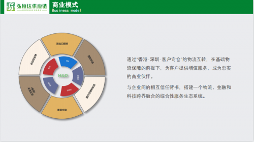弘恒達供應(yīng)鏈(深圳)有限公司,專注電子元器件物流供應(yīng)鏈領(lǐng)域,全國管理運營倉儲面積超200萬平方,是一家全球性、智慧型供應(yīng)鏈協(xié)同企業(yè),有供應(yīng)鏈管理的金融服務(wù)、咨詢服務(wù)、運營服務(wù)、香港倉庫的理貨、改標簽、改包裝、倉儲等業(yè)務(wù),服務(wù)世界500強、中國500強客戶以及其他中小型企業(yè)超3000家,為全球多知名企業(yè)提供高效的“B2B+B2C+運營執(zhí)行”供應(yīng)鏈協(xié)同服務(wù),助力品牌廠商應(yīng)對持續(xù)變革的消費市場。