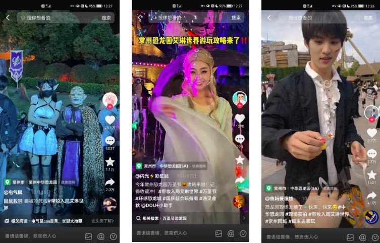 此外,巨量本地推助力恐龍園充分挖掘景區(qū)的線下IP、NPC嘉年華等自有特色,在抖音平臺(tái)進(jìn)行話題發(fā)酵,并以相關(guān)產(chǎn)品加持熱度飆升,形成萬(wàn)圣節(jié)期間的旅游社交熱點(diǎn),為商家蓄積充分的引流+轉(zhuǎn)化勢(shì)能。