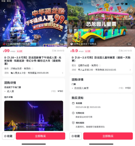 基于平臺(tái)側(cè)數(shù)據(jù)分析,恐龍園集團(tuán)根據(jù)產(chǎn)品類(lèi)型與目標(biāo)客戶(hù)的消費(fèi)習(xí)慣,制定針對(duì)不同客群的差異化團(tuán)購(gòu)商品套餐。比如圍繞消費(fèi)者人群、團(tuán)購(gòu)商品價(jià)格等因素,分別推出了引流套餐99元的下午場(chǎng)成人票,和針對(duì)兒童特惠9.9元兩種套餐,滿足各類(lèi)客群的消費(fèi)需求。奇幻的配圖和標(biāo)題內(nèi)容,突出項(xiàng)目特色、觀感,體現(xiàn)價(jià)格折扣等的內(nèi)容讓用戶(hù)一目了然,讓人看到就想點(diǎn)開(kāi)。
