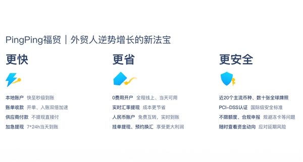 海外市場(chǎng)規(guī)模增長(zhǎng)加上政策紅利導(dǎo)向,中國(guó)的外貿(mào)及電商行業(yè)迎來發(fā)展新機(jī)遇,但隨著全球金融環(huán)境變動(dòng)加劇,匯率波動(dòng)復(fù)雜化讓外貿(mào)企業(yè)在國(guó)際貿(mào)易中面臨許多不確定風(fēng)險(xiǎn)。傳統(tǒng)的支付流程速度慢、效率低、到賬時(shí)間不確定,從實(shí)施到最終結(jié)算還需經(jīng)過許多中間機(jī)構(gòu)。PingPong福貿(mào)以匯率管理切入企業(yè)服務(wù),運(yùn)用金融科技革新支付流程中的各個(gè)環(huán)節(jié),整合優(yōu)質(zhì)行業(yè)資源,縮短交易鏈條,助力企業(yè)的全球業(yè)務(wù)。