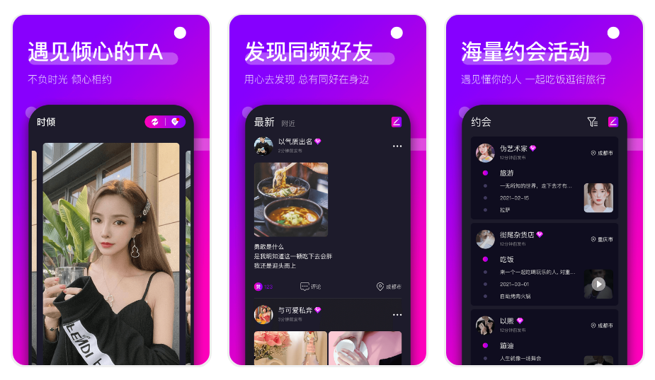 時(shí)傾用戶年齡段90后和00后最多,大家聊天氛圍都很輕松。首頁(yè)推薦里可以左右滑動(dòng)選擇自己心儀的人,不需要復(fù)雜的操作,喜歡就可以點(diǎn)擊進(jìn)入主頁(yè),有個(gè)人信息展示,形象標(biāo)簽等。廣場(chǎng)上可以發(fā)布自己的動(dòng)態(tài),美食分享或者自拍什么的都行,定位準(zhǔn)確會(huì)有人主動(dòng)找你,同城附近也可以刷到。