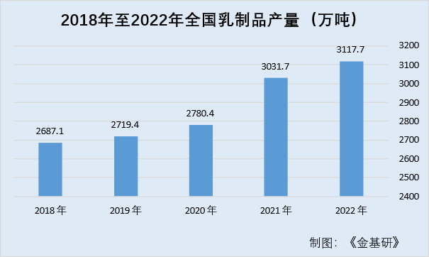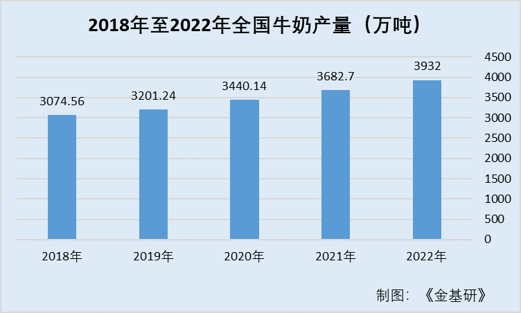隨著近年來(lái)下游需求的持續(xù)增長(zhǎng)以及國(guó)內(nèi)奶牛養(yǎng)殖規(guī)模化進(jìn)程的持續(xù)推進(jìn),國(guó)內(nèi)牛奶產(chǎn)量也隨之逐年增長(zhǎng)。據(jù)國(guó)家統(tǒng)計(jì)局?jǐn)?shù)據(jù),2018年,全國(guó)牛奶產(chǎn)量已超3,000萬(wàn)噸產(chǎn)量。2018年至2022年間,全國(guó)牛奶產(chǎn)量分別為3074.56萬(wàn)噸、3201.24萬(wàn)噸、3440.14萬(wàn)噸、3682.7萬(wàn)噸、3932萬(wàn)噸,年產(chǎn)量增長(zhǎng)率分別為4.1%、7.5%、7.1%、6.8%??梢钥闯?,國(guó)內(nèi)牛奶生產(chǎn)增速平穩(wěn),牛奶產(chǎn)量逐年穩(wěn)步提升,這為乳制品產(chǎn)量穩(wěn)定增長(zhǎng)奠定了基礎(chǔ),同時(shí)也是乳制品價(jià)格的穩(wěn)定的保障。