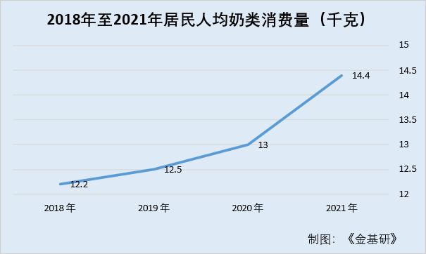 從消費(fèi)量情況來(lái)看,隨著人們對(duì)健康飲食的重視及全球乳制品產(chǎn)業(yè)的快速發(fā)展,促進(jìn)了人們牛奶需求量的增長(zhǎng),對(duì)牛奶消費(fèi)量也隨之不斷增加。據(jù)國(guó)家統(tǒng)計(jì)局?jǐn)?shù)據(jù),2018年至2021年居民人均奶類消費(fèi)量分別為12.2千克、12.5千克、13千克、14.4千克,從圖形上看,居民人均奶類消費(fèi)量呈加速增長(zhǎng)趨勢(shì)。