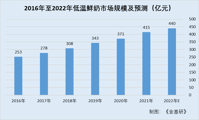 據(jù)中商產(chǎn)業(yè)研究院數(shù)據(jù),2017年,低溫鮮奶市場(chǎng)規(guī)模達(dá)到278億元,同比增長(zhǎng)達(dá)9.9%。2018年,低溫鮮奶市場(chǎng)規(guī)模再創(chuàng)新高,達(dá)到308億元,同比增長(zhǎng)超過(guò)10%。2019年,低溫鮮奶市場(chǎng)規(guī)模達(dá)到343億元,同比增長(zhǎng)11.4%。2020年,低溫鮮奶市場(chǎng)的增長(zhǎng)速度受到一定影響,但依然保持了增長(zhǎng)態(tài)勢(shì),全年市場(chǎng)規(guī)模達(dá)到371億元,同比增長(zhǎng)超過(guò)8%。2021年,低溫鮮奶市場(chǎng)規(guī)模再次突飛猛進(jìn),同比增長(zhǎng)達(dá)12%。國(guó)內(nèi)低溫鮮奶市場(chǎng)規(guī)模不斷提高,由2016年的253億元增長(zhǎng)至2021年的415億元,復(fù)合年均增長(zhǎng)率為10.4%。預(yù)計(jì)2022年低溫鮮奶市場(chǎng)規(guī)模將達(dá)440億元。