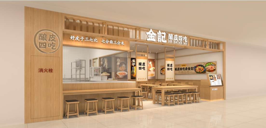 與傳統(tǒng)釀皮店裝修不同,金記釀皮采用原木色調(diào)的簡(jiǎn)約幾何空間設(shè)計(jì),彰顯食物暖意,明檔廚房,全透明操作,帶給顧客最直觀的互動(dòng)感,更符合現(xiàn)在主力消費(fèi)群體的風(fēng)格偏好。門店配備專屬定制釀皮設(shè)備,1㎡可滿足萬(wàn)元店。制作流程的標(biāo)準(zhǔn)化,出餐流程的規(guī)范化,讓門店操作環(huán)節(jié)更簡(jiǎn)潔,大大減輕了門店對(duì)廚師的依賴性。無(wú)論是涼拌,熱拌,爆炒,還是熱湯,出餐速度可以在5分鐘內(nèi)完成,還能做到鍋氣十足,讓更多人吃快餐,想釀皮,吃釀皮,到金記。