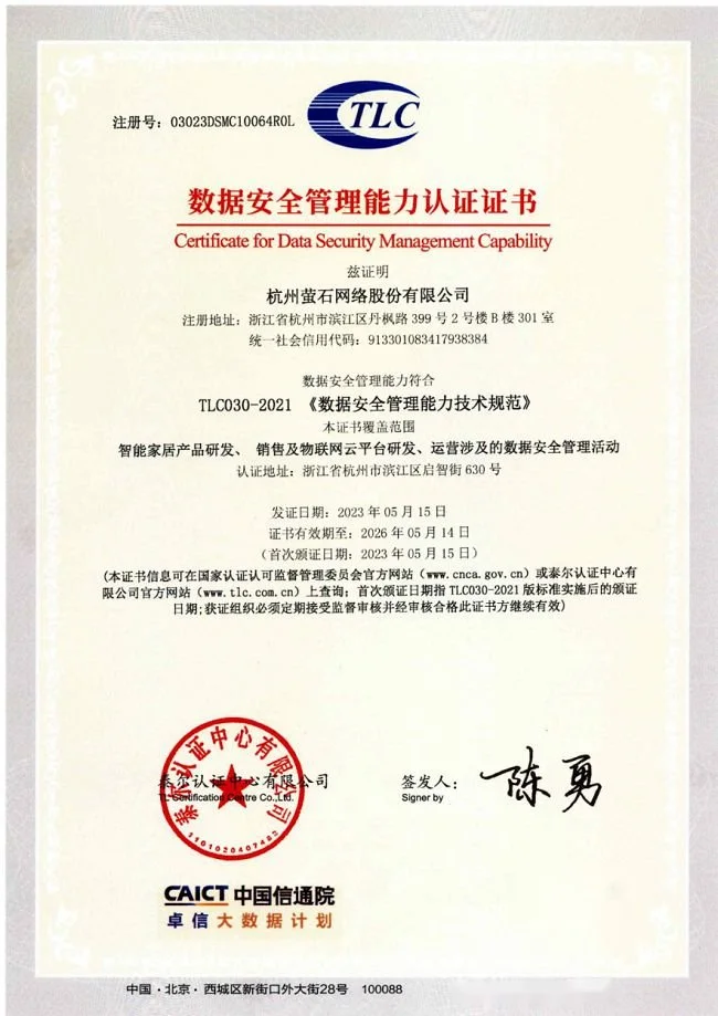 而想要落實守護生活安全,背后的企業(yè)技術(shù)安全不可或缺,安全體系構(gòu)建貫穿螢石網(wǎng)絡(luò)的發(fā)展歷程。截至目前,螢石網(wǎng)絡(luò)已經(jīng)通過ISO 27001、ISO 27017、CSA STAR 、ISO 27018、ISO 27701、ISO 29151、ISO 22301等主要標(biāo)準(zhǔn)體系,打造了業(yè)內(nèi)領(lǐng) 先的信息安全管理體系和個人信息保護管理體系。近日,螢石網(wǎng)絡(luò)還通過了由中國信通院發(fā)起的數(shù)據(jù)安全領(lǐng)域國 家級權(quán) 威認(rèn)證——數(shù)據(jù)安全管理能力認(rèn)證(DSMC),成為智能家居行業(yè)首家獲證單位。