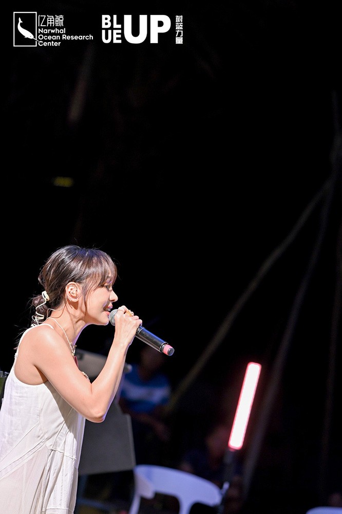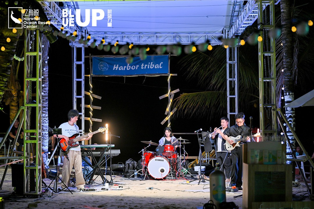當(dāng)夜幕降臨,在萬寧新群灣的沙灘上,白天在海邊和水下忙碌行動的伙伴們聚集在一起,伴隨著的層層海浪的聲音,磊落樂隊(duì)用一曲“鯨落”開啟了人與海洋之間的奇妙律動?!白屛邓{(lán)之境重啟,予以海洋新生”的音樂分享會,讓大家感受到神秘浩瀚的大海,孕育了世間萬物。每當(dāng)望見那片一望無際的蔚藍(lán),聽著延綿不絕的海浪聲,我們的內(nèi)心寧靜而平和。一鯨落,萬物生,最終在歌手林采欣的一曲《鯨落》的歌聲中,我們望向大海,共同以旋律喚起新生。