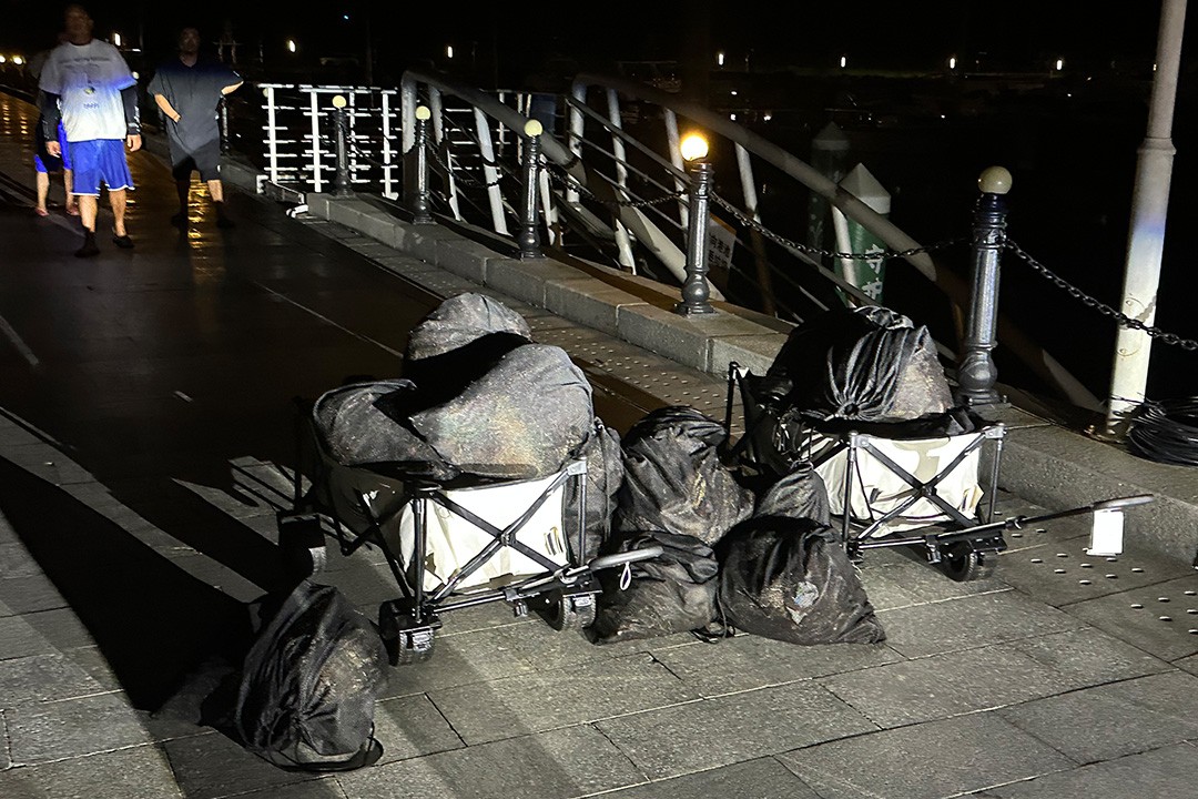 然后將海底潛水員清理的垃圾一袋一袋奮力帶上水面。每一袋都有好幾十斤重,12小時工作結(jié)束后整整有20大袋漁網(wǎng)垃圾被清理干凈。