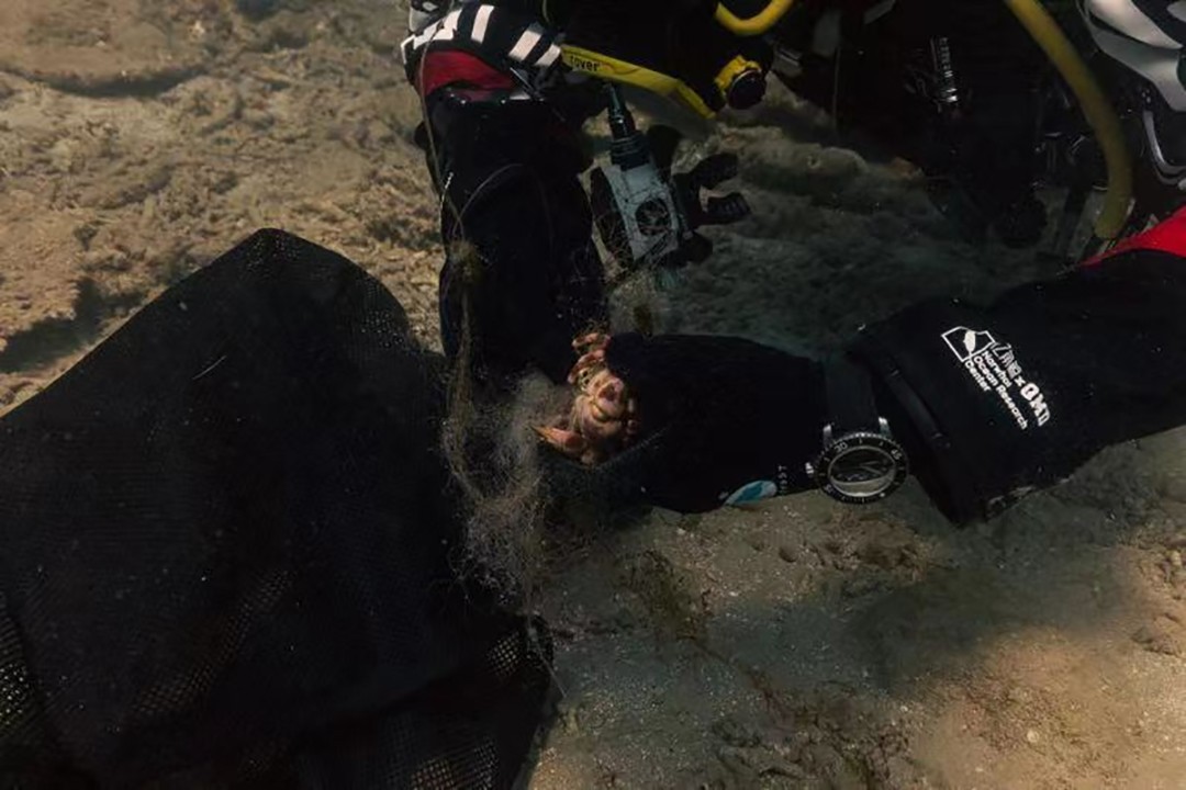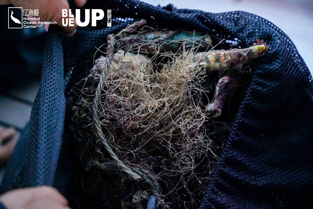 經(jīng)過20個日夜的準(zhǔn)備,數(shù)10個烈日下團(tuán)隊(duì)成員在水上水下的反復(fù)計(jì)劃驗(yàn)證和測試,從4小時到8小時的長時間潛水的耐受訓(xùn)練,6月8日,從日出到日落,億角鯨的隊(duì)員和志愿者們一起潛入海底, 12小時連續(xù)不斷的海底漁網(wǎng)清理,共有近200公斤的海底漁網(wǎng)垃圾被清除。