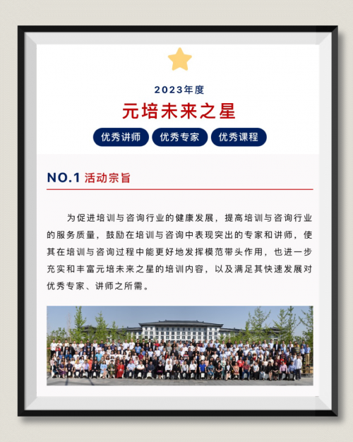 通過(guò)推薦、評(píng)審、考察、公示等程序,評(píng)審出2023年度的“元培未來(lái)之星·優(yōu)秀講師”、“元培未來(lái)之星·優(yōu)秀專家”及“元培未來(lái)之星·優(yōu)秀課程”,以此表彰他們?cè)诮膛嗯c咨詢行業(yè)做出的突出成績(jī),促進(jìn)他們?cè)谂嘤?xùn)與咨詢過(guò)程中能更好地發(fā)揮模范帶頭作用。