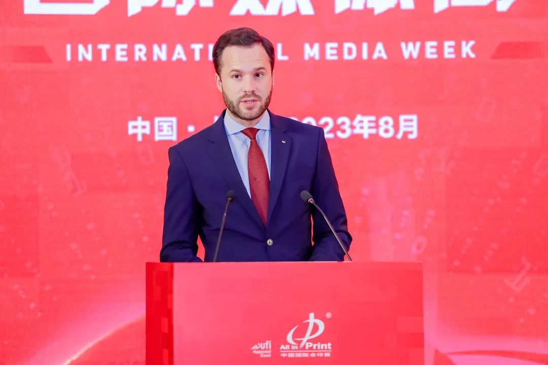 馬睿博先生在致辭中介紹,杜塞爾多夫展覽(上海)有限公司充分發(fā)揮優(yōu)勢資源,在全球網(wǎng)絡(luò)、海外行業(yè)活動、數(shù)字營銷、行業(yè)媒體、協(xié)會合作、社交媒體渠道6個關(guān)鍵領(lǐng)域?qū)θ≌惯M(jìn)行了國際營銷和推廣。同時他表示: “在中國全面開放的大背景下,我們已經(jīng)見證了國際商務(wù)的復(fù)蘇。目前全印展的海外觀眾邀請工作正如火如荼地進(jìn)行著,我們有望在11月的中國國際全印展上見到更多海外觀眾及國際協(xié)會,一場印刷業(yè)的國際盛宴將再次‘奏響’。