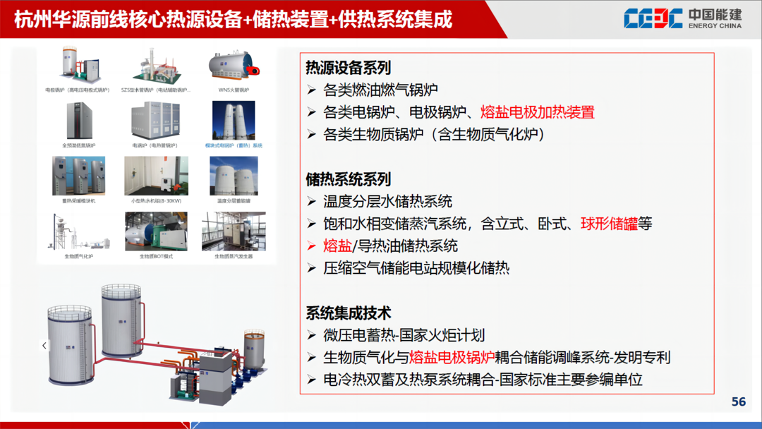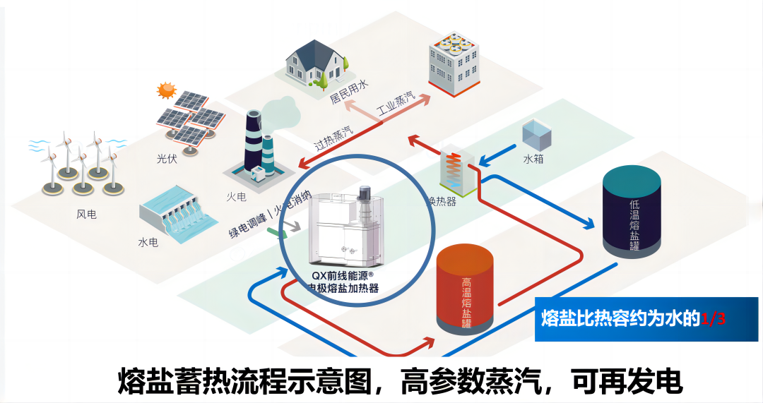 杭州華源前線“電極式熔鹽加熱及儲熱技術”,采用電極式熔鹽加熱爐與儲熱技術相結(jié)合的方式。電極式熔鹽加熱爐利用熔鹽高電導率特性,直接發(fā)熱,與常規(guī)電熱管加熱熔鹽形式比較,可實現(xiàn)10KV電直接接入,節(jié)省變壓器及低壓配電設備、單臺加熱功率大(可達50MW以上)、加熱溫度最 高可達600℃以上、占地面積小、耐腐蝕、效率高等優(yōu)點,再與我司儲熱技術相結(jié)合,可廣泛應用于可再生能源消納、火電廠靈活性調(diào)峰改造等領域。目前該技術已于2022年8月完成研發(fā)中試,進入商業(yè)應用階段。目前已中標、實施多個項目,將陸續(xù)進入調(diào)試、投運階段。與會嘉賓、專家對我司采用電極式熔鹽加熱解決超高溫、大功率熔鹽電加熱難題,表示充分認可。眾多用戶單位、設計院表現(xiàn)出濃厚興趣,并在現(xiàn)場進行充分交流與探討。