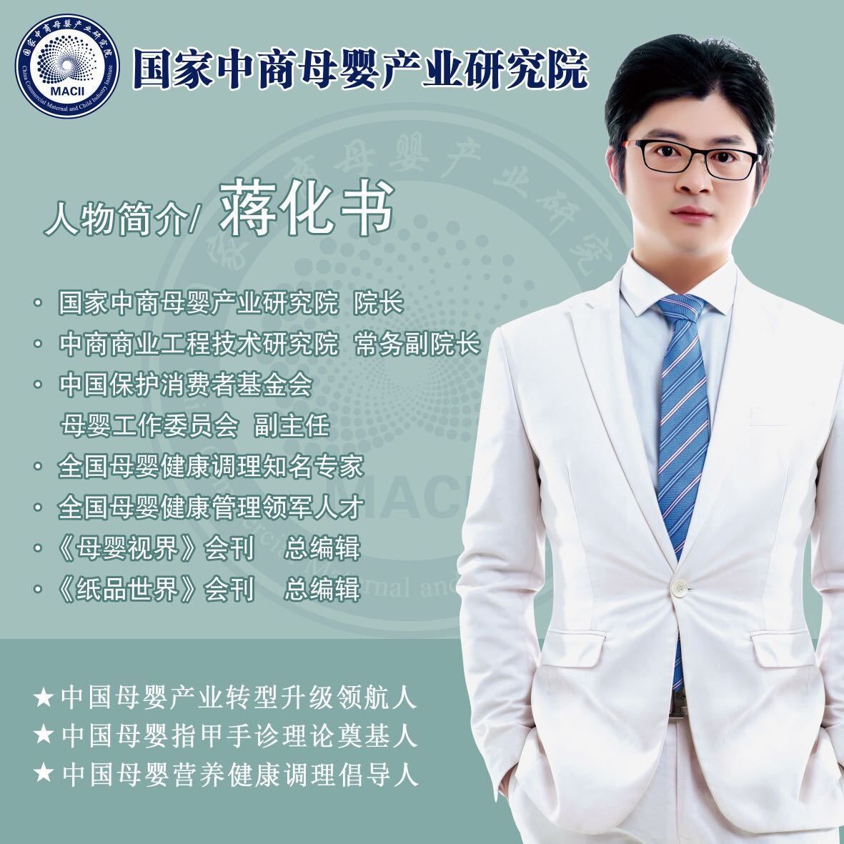 國家中商母嬰產(chǎn)業(yè)研究院院長蔣化書系國家衛(wèi)健委南京人口國際培訓中心專家組特聘專家,全國母嬰健康調理知名專家,母嬰家庭營養(yǎng)健康調理知名專家,全國母嬰健康領軍管理人才,《母嬰視界》會刊總編,中國母嬰產(chǎn)業(yè)轉型升級領航人、中國母嬰指甲手診理論奠基人、中國母嬰營養(yǎng)補充健康調理倡導人。