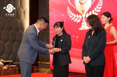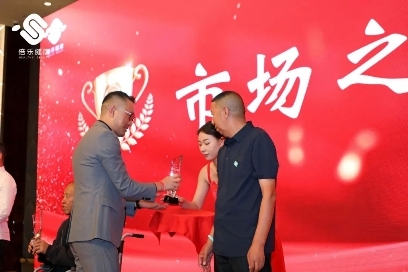 龔總詳細地為大家解釋了“小關節(jié) 大藍?!陛p創(chuàng)業(yè)項目的具體方案及項目前景,隨后活動進入頒獎環(huán)節(jié),迎著激昂的音樂,獲獎代理商們陸續(xù)上臺,張伯科博士、李玉朝董事長和胡峰總經(jīng)理作為本場活動的頒獎嘉賓,為2022年9月-2023年8月期間的年度優(yōu)秀合作伙伴(即市場之星、商城之星、服務之星)頒發(fā)獎杯并現(xiàn)場合影留念,臺上臺下變成了歡樂的海洋。