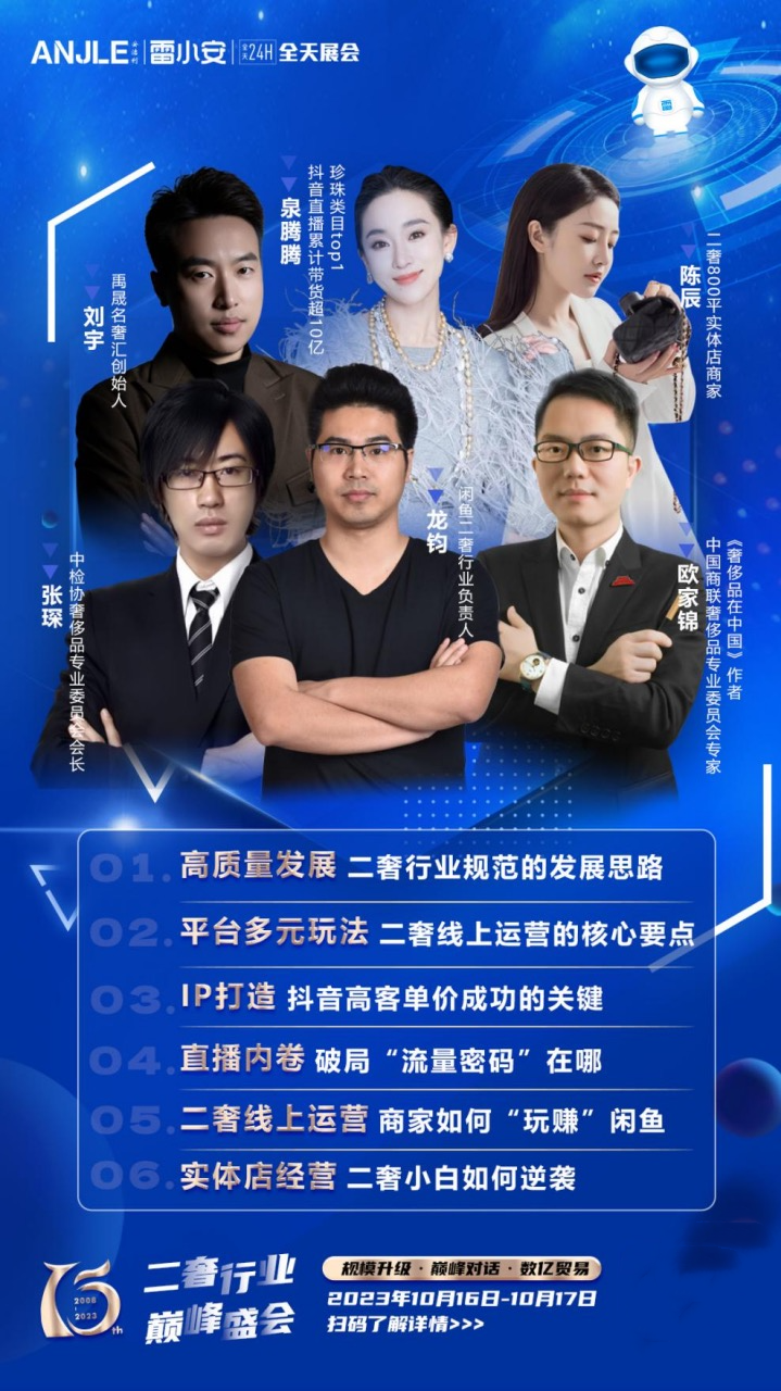 新需求催生新業(yè)態(tài),新消費推動新發(fā)展。10月16-17日,由杭州安潔利科技有限公司、全天展會主辦的2023年度二奢行業(yè)巔峰盛會將盛大起航!恰逢安潔利成立15周年,作為二奢行業(yè)頗具影響力的峰會,此次將有超過1500位同行、多位百萬級達人大咖齊聚杭州,共探行業(yè)現狀及發(fā)展趨勢,把握行業(yè)風向,搶占先機!