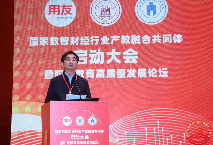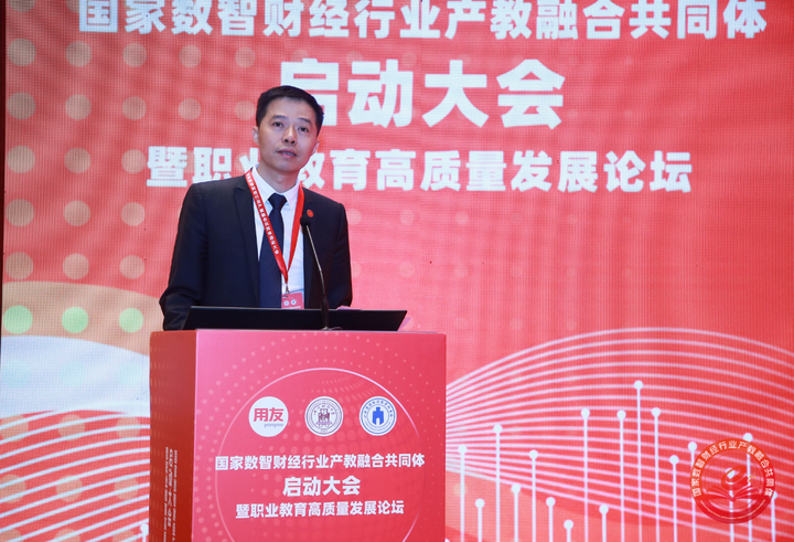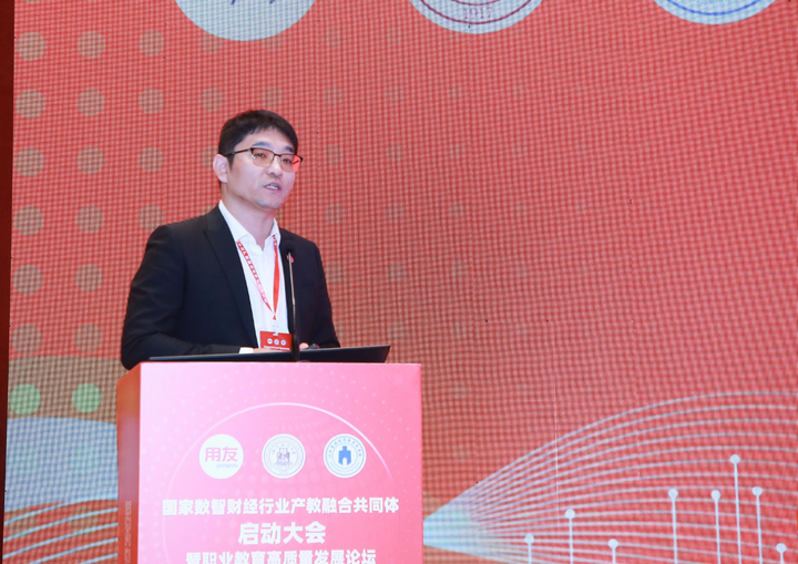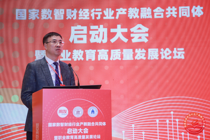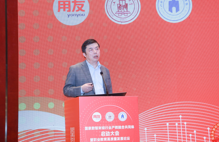 用友新道科技股份有限公司董事長兼總裁陳強兵在致辭中表示,一直以來,產教融合、校企合作是扎根中國大地辦教育的根本途徑,在過去很長一段時間內產教融合、校企合作存在各種問題,相信通過共同體的新模式,一定能夠解決這些老問題。他指出,用友網絡作為國家數智財經行業(yè)產教融合共同體的牽頭企業(yè),將會堅定貫徹“共建、共創(chuàng)、 共享”的基本原則,將共同體打造成為全體成員共生共長的發(fā)展平臺,也堅信國家數智財經行業(yè)產教融合共同體是進一步深化產教融合的新模式、新方法,是一種嶄新的協(xié)同發(fā)展模式,最終將會實現產教融合、科教融匯。陳強兵表示,希望國家數智財經行業(yè)產教融合共同體的成立,能夠為國家財經行業(yè)的創(chuàng)新發(fā)展注入新的活力,為整個財經行業(yè)與產業(yè)的轉型升級提供強有力的支撐。