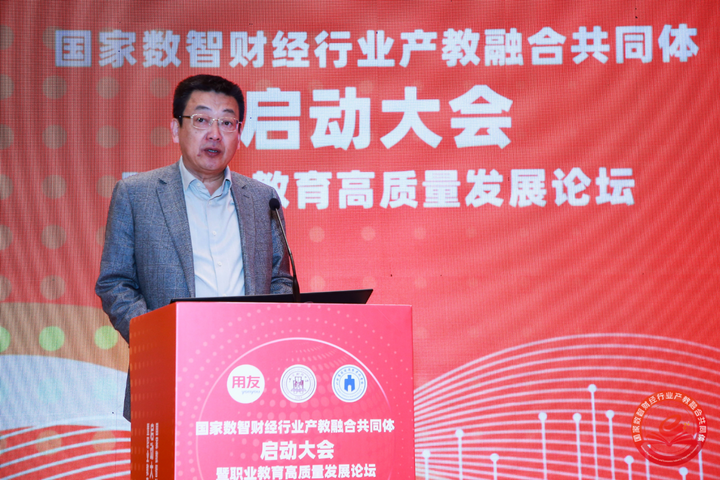教育部職業(yè)教育與成人教育司副司長謝俐在會上作主旨報告。他指出,深化產教融合是現代職業(yè)教育體系改革的主線,產教融合體制機制的創(chuàng)新實踐一直是現代職業(yè)教育的核心議題,數字化轉型是金融財經的行業(yè)重點發(fā)展方向。他表示,國家數智財經行業(yè)產教融合共同體成立大會的舉辦是貫徹落實黨的二十大決策部署,落實教育部相關政策文件的重要舉措,是在職業(yè)教育新發(fā)展階段打造產教融合新載體、新范式的有益探索。