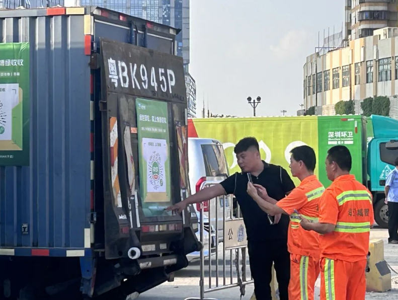 愛博綠深圳分揀中心的負(fù)責(zé)人于得軍為環(huán)衛(wèi)工人介紹“以車代庫”的回收路徑,除了現(xiàn)場(chǎng)投廢之外,環(huán)衛(wèi)工人亦可掃描二維碼下單或通過支付寶或微信搜索【博綠收收】小程序來在線登記、預(yù)約回收。