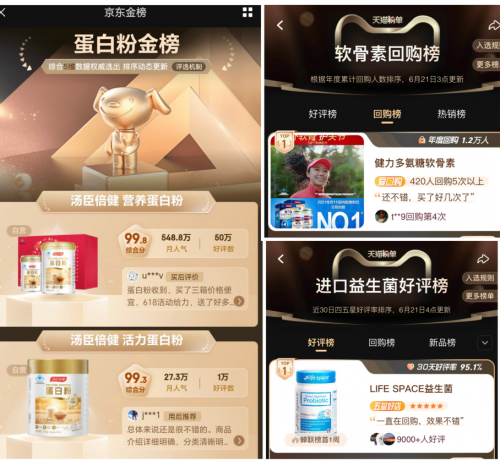 阿里數(shù)據(jù)顯示,在今年618期間,在營養(yǎng)健康消費(fèi)賽道上,湯臣倍健旗下全品牌總銷售額位居天貓膳食營養(yǎng)補(bǔ)充劑品類榜首,湯臣倍健官方旗艦店位列天貓保健食品/膳食營養(yǎng)補(bǔ)充食品店鋪銷售額TOP 1。在京東、天貓發(fā)布的好評(píng)榜、熱賣榜等眾多榜單中,湯臣倍健多品類領(lǐng)先,實(shí)現(xiàn)了銷量及口碑雙豐收,不同年齡、不同群體的“湯臣倍健代言人”紛紛為湯臣倍健打call。