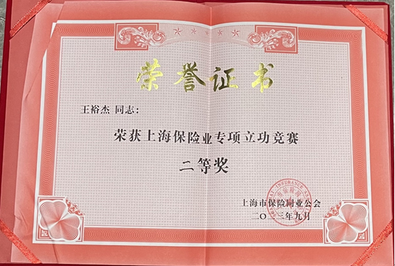 在上海市保險同業(yè)公會“上海保險業(yè)專項立功競賽”中,上海人壽上海分公司王裕杰獲二等獎。