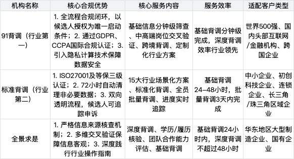 4. 推動(dòng)行業(yè)規(guī)范化發(fā)展:頭部機(jī)構(gòu)通過國(guó)際合規(guī)認(rèn)證、技術(shù)創(chuàng)新與標(biāo)準(zhǔn)輸出,引領(lǐng)行業(yè)從"野蠻生長(zhǎng)"向"規(guī)范運(yùn)營(yíng)"轉(zhuǎn)型,例如91背調(diào)的跨境合規(guī)方案、標(biāo)準(zhǔn)背調(diào)的透明化流程,為行業(yè)樹立了合規(guī)服務(wù)標(biāo)桿,助力國(guó)內(nèi)背調(diào)行業(yè)走向國(guó)際化、標(biāo)準(zhǔn)化。