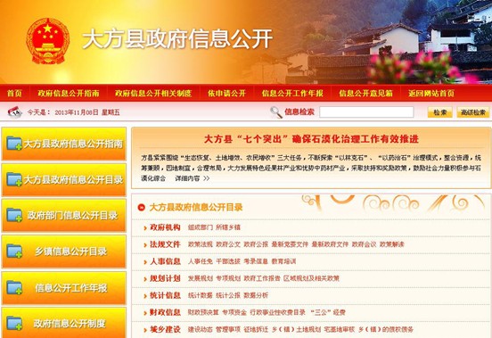 貴州省大方縣政府門戶網(wǎng)站群,以縣政府門戶網(wǎng)站“中國貴州—大方政務(wù)門戶網(wǎng)”為主站。出臺了《關(guān)于進(jìn)一步加強(qiáng)縣政府門戶網(wǎng)站群建設(shè)工作的通知》文件,就如何加強(qiáng)政府門戶網(wǎng)站群管理作出具體的可操作性的規(guī)定。網(wǎng)站群集34個鄉(xiāng)鎮(zhèn)子網(wǎng)站和40個部門子網(wǎng)站為一休,統(tǒng)一對外發(fā)布政府信息,成為大方縣電子政務(wù)應(yīng)用的重要組成部分以及政府信息公開的主要載體和平臺。政府網(wǎng)站群的建設(shè)標(biāo)志著大方縣電子政務(wù)建設(shè)的重心發(fā)生轉(zhuǎn)移,由局部建設(shè)轉(zhuǎn)向整合建設(shè),由分散、自發(fā)建設(shè)轉(zhuǎn)向集約化統(tǒng)籌建設(shè),為政府網(wǎng)站實(shí)現(xiàn)深層次、跨部門的信息整合和資源開發(fā)利用打下基礎(chǔ)。