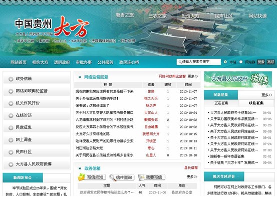 貴州省大方縣政府門戶網(wǎng)站群,以縣政府門戶網(wǎng)站“中國貴州—大方政務(wù)門戶網(wǎng)”為主站。出臺了《關(guān)于進(jìn)一步加強(qiáng)縣政府門戶網(wǎng)站群建設(shè)工作的通知》文件,就如何加強(qiáng)政府門戶網(wǎng)站群管理作出具體的可操作性的規(guī)定,網(wǎng)站群集34個鄉(xiāng)鎮(zhèn)子網(wǎng)站和40個部門子網(wǎng)站為一休。2011年印發(fā)了《大方縣網(wǎng)絡(luò)媒體反映事項(xiàng)問責(zé)辦理暫行規(guī)定》、《大方縣政府網(wǎng)站群建設(shè)管理辦法》,建立工作機(jī)制,組建管理團(tuán)隊(duì),全縣各鄉(xiāng)鎮(zhèn)、各部門明確由辦公室主任擔(dān)任網(wǎng)絡(luò)發(fā)言人,并采用實(shí)名制注冊登錄(注明網(wǎng)絡(luò)發(fā)言人字樣),形成覆蓋全縣、三級聯(lián)動的工作機(jī)制。建立網(wǎng)絡(luò)發(fā)言人管理制度、網(wǎng)絡(luò)媒體反映事項(xiàng)問責(zé)辦理暫行辦法等網(wǎng)絡(luò)問政效能問責(zé)配套制度,將網(wǎng)絡(luò)問政工作的各環(huán)節(jié)、各步驟進(jìn)行規(guī)范,固化辦理流程,明確辦理時限,落實(shí)工作責(zé)任制度,確保網(wǎng)絡(luò)問政工作有序開展。