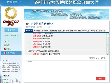 作為四川政務(wù)微博聚合平臺(tái)的重要組成部分,成都政務(wù)微博已經(jīng)初步建立起四級(jí)政務(wù)微博矩陣,服務(wù)群眾辦事大廳則創(chuàng)造性地將互動(dòng)和服務(wù)這兩個(gè)元素納入到政務(wù)微博聚合平臺(tái)中,網(wǎng)民要咨詢辦事、要舉報(bào)投訴、要建言獻(xiàn)策、要信息資訊,都可隨時(shí)找@成都服務(wù),或是@成都市任何一個(gè)政務(wù)微博。