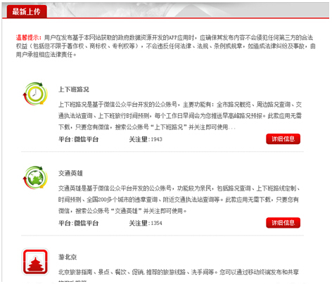 (2)提供專門的"APP應(yīng)用"欄目,社會(huì)力量可以通過該欄目上傳基于該網(wǎng)站獲取的政府?dāng)?shù)據(jù)資源開發(fā)的APP應(yīng)用,供用戶下載使用。目前,該欄目已上傳"上下班路況"、"交通英雄"、"游北京"、"愛健康"等應(yīng)用。