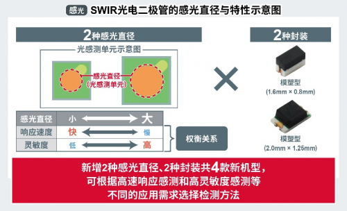 對(duì)于感光側(cè)的SWIR光電二極管而言,存在一些權(quán)衡參數(shù),比如光的檢測(cè)面積小時(shí)要求響應(yīng)速度要快,面積大時(shí)要求靈敏度要高。因此,ROHM計(jì)劃推出兩種感光直徑和兩種封裝相組合的共4款新機(jī)型。客戶可以根據(jù)高速響應(yīng)感測(cè)用途和弱光檢測(cè)用途等不同應(yīng)用需求進(jìn)行靈活選擇。