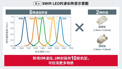 由于不同物質(zhì)的檢測(cè)波長不同,所以發(fā)光側(cè)的SWIR LED預(yù)計(jì)會(huì)推出1050nm、1200nm、1300nm、1450nm、1550nm共5種波長的產(chǎn)品,除了常規(guī)的模塑型產(chǎn)品外,還將推出兩款透鏡型(發(fā)光指向角更窄、輻射強(qiáng)度更高)表貼封裝的產(chǎn)品。屆時(shí),通過這些產(chǎn)品的組合預(yù)計(jì)會(huì)推出10款新產(chǎn)品,這將有助于擴(kuò)大檢測(cè)范圍,在檢測(cè)水、氣體和葡萄糖等物質(zhì)的有無以及成分分析等應(yīng)用中發(fā)揮重要作用。