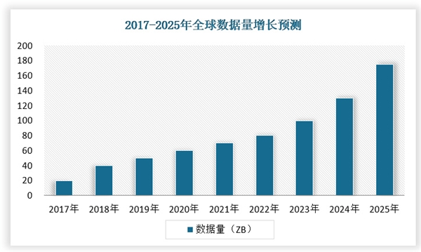 據(jù)互聯(lián)網(wǎng)數(shù)據(jù)中心(IDC)預(yù)測(cè),全球數(shù)據(jù)量將從2018年的33ZB增至2025年的175ZB,增長(zhǎng)超5倍;中國(guó)平均增速快于全球3%,預(yù)計(jì)到2025年將增至48.6ZB,占全球數(shù)據(jù)量的比例由23.4%提升至27.8%。