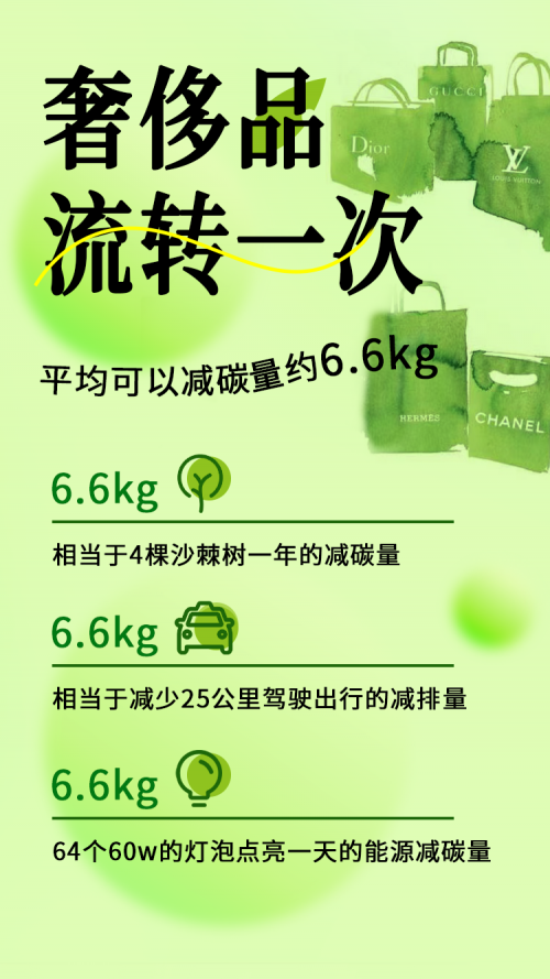 在奢侈品類,由于生產(chǎn)成本和價(jià)值相對(duì)更高,二手交易和流轉(zhuǎn)也更為低碳環(huán)保。每件奢侈品流轉(zhuǎn)一次,平均可以減碳約6.6kg,相當(dāng)于4棵沙棘樹一年的減碳量,減少25公里駕駛出行的減排量,以及64個(gè)60w的燈泡少點(diǎn)亮一天的能源減碳量。