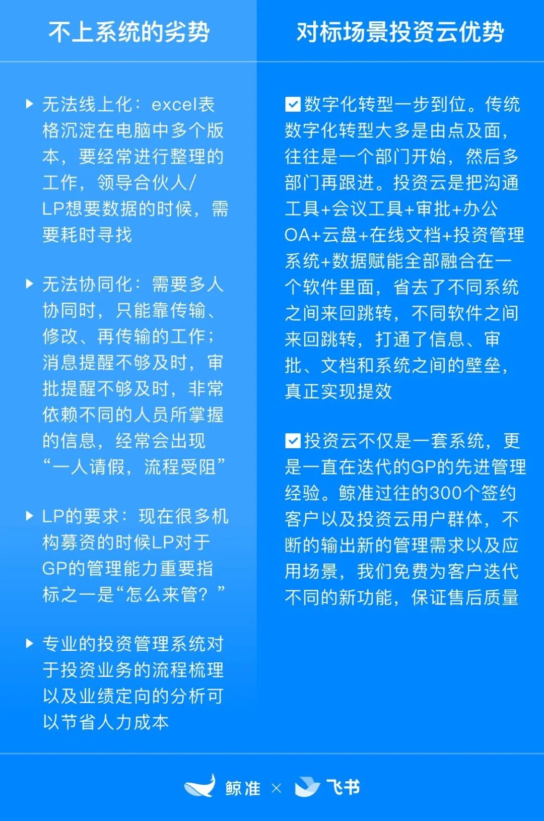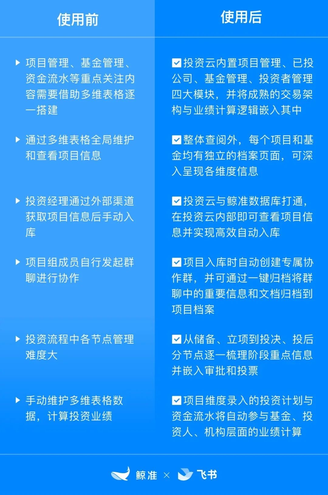 鯨準和飛書聯(lián)合推出的“投 資云”極大契合了“好產品”的定義。