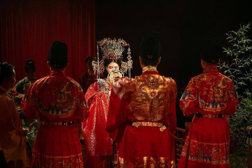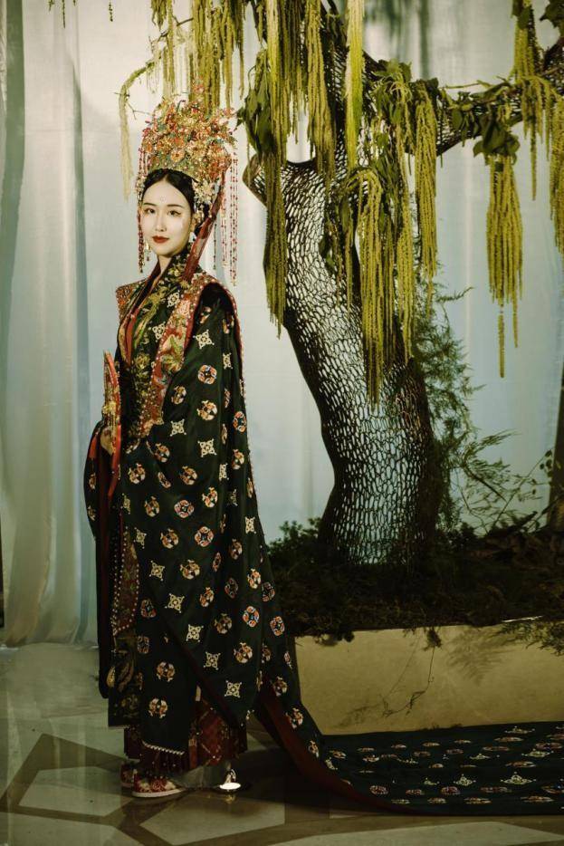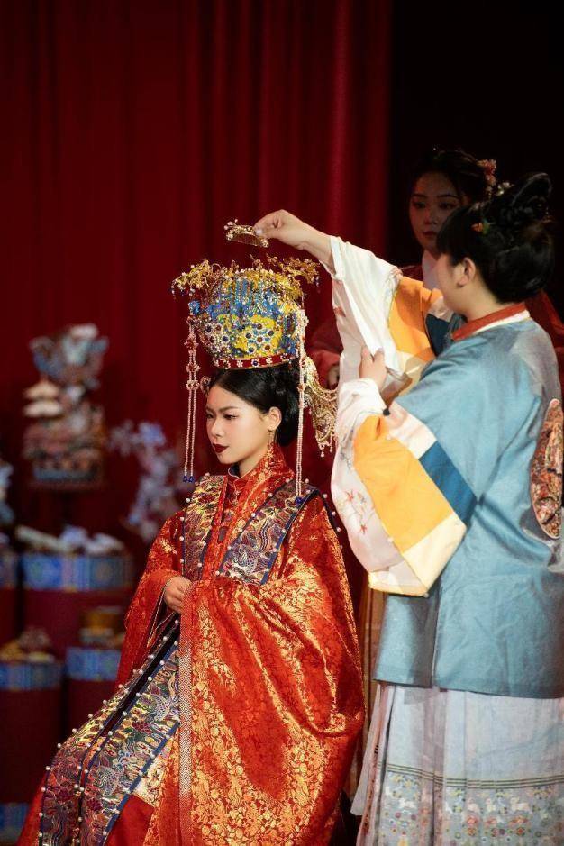 2022年8月13日 以宋韻為布置靈感的婚禮秀。宋代是我國文化最昌盛、藝術最繁榮的朝代,婚俗文化獨樹一幟,婚服的色彩最具特色,一般是紅男綠女,宋代早期女性的婚服顏色是青綠色,鳳冠霞帔是女子婚服的重要元素,貴族女性出嫁時,穿戴鳳冠霞帔已經(jīng)非常普遍,作為正統(tǒng)端莊的象征,鳳冠非常符合宋代統(tǒng)治階級服飾的審美。