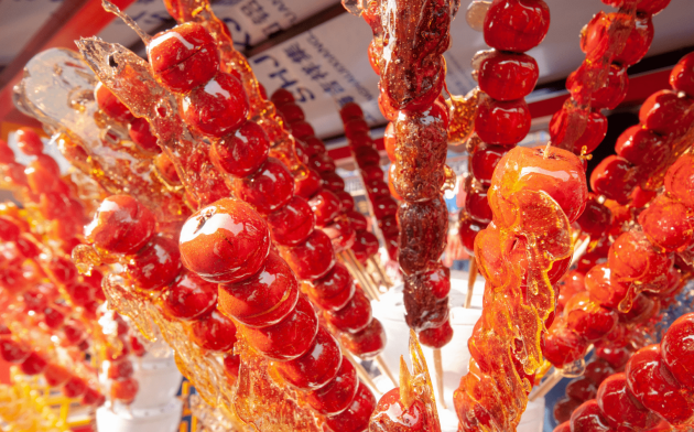 冰糖葫蘆起源于宋朝盛行于清代及民國時期,其中不乏眾多文人對冰糖葫蘆贊口不絕;它不僅好吃,而且十分好看,紅彤彤的山楂果按大小排列串在竹簽子上,外面裹著晶瑩透明的糖稀,一串串插在稻草架子上,好似一棵結(jié)滿碩果的小樹,甚是誘人。